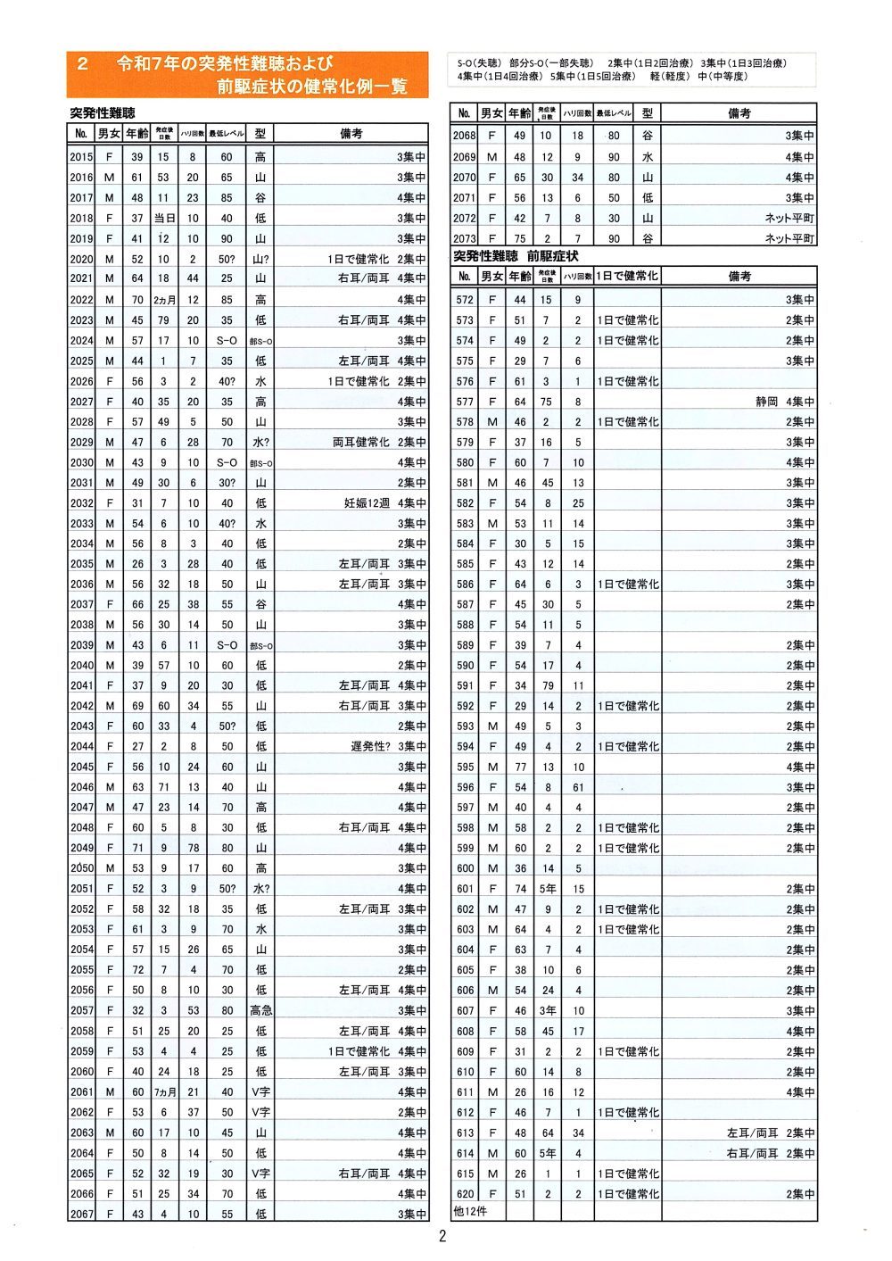 2026年度 いっしょう健康倶楽部 会報第31号を発行いたしました。年1回発行のいっしょう健康倶楽部では、1年間の治療実績をお知らせしています。 1. 本年度のネットワークの健常化は166例令和6年12月から令和7年11月までの1年間で「突発性難聴ハリ治療ネットワーク」のハリ治療によって健常化(元の正常な状態に戻ること)に至った突発性難聴等の症例は166例(うち本部の一掌堂治療院での健常化例は162例)です。 私たちは「できるだけ少ない治療回数で高い治療効果を上げる治療法」を模索し続けていますが、本年度も「集中漸減療法」によってその目的が果たされました。 これは、病院のステロイドパルス療法にヒントを得て開発した治療法で、1日目は4回、2日目は3回、3日目は2回、4日目は1回のハリ治療を行います。以降は1~2回の治療を継続します。このほか1日目4回、2日目と3日目に3回の3日間で1クール10回の集中治療や、遠方からの宿泊集中治療として連日4回の治療も行っております。いずれも患者さんの状況やご希望によって施術するものです。従来のハリ治療では1日1回というのが一般的でしたが、それに捉われない「集中漸減療法」によって「できるだけ早くできるだけ少ない回数での健常化」が実現でき、難しい症例においても健常化する例が増えてきていることはうれしい限りです。2. デフリンピックのボランティア活動でハリ治療をしました11月23日~24日 東京都鍼灸師会が運営する「デフリンピックはりケアステーション」において 院長とスタッフ2名がハリ治療をしました。手話ができる私たち3人は皆さんのお役に立つことが できて、大変喜んでいただけました。3. めまい救急法を開発しましためまいの方が最近増えてきています。天井が回って立てなくなるほどのめまいが襲ってきたらまった く動きがとれなくなりますから救急車を呼ぶことになりますが、その前に、ふらふらしておかしいと気 づく段階においてご自身で対応すると、大事に至ることなく治まることがあります。その対応法を 開発しました。詳しくは治療院にお問い合わせください。4. 「集中漸減療法」によって回復した重症例(例1)山口からの患者さん、85歳。補聴器を付けてもほとんど聞こえず筆談でコミュニケーションをとる状態から、3日間にわたって毎日4回ずつ治療した結果、補聴器をはずして普通に会話ができるまでに回復。 (例2)広島からの患者さん、74歳。発症後4年経過のスケールアウトの状態から毎日4回ずつの治療を全42回にわたって行った結果、普通に会話ができるまでに回復。【データ収集の対象】突発性難聴をはじめとする耳の症状を主訴として、突発性難聴ハリ治療ネットワーク参加治療院で受診、健常化なさった患者さんの症例を集計した数です。 |